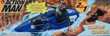 The final version had a figure that was adapted to look more the like 3 ¾” figure with a molded T-shirt torso but without the .30 cal and just a face mask. Still included were the kayak paddle, boonie hat, knife, sheath, boots, sewn shorts and an Action Man assault rifle with three clips that fit onto the strap. The kayak came from Hasbro Action Man Canoe.