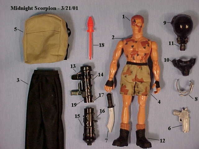This is a desert adventure with a reversible uniform and a take-apart RPG launcher, so the obvious RAH character was Dusty. For the night mode, we wore a black sleeveless jumpsuit and a black helmet with flip-down night vision goggles. His weapon was a 2-piece rocket-propelled grenade launcher that shot a projectile with a high-tech grenade tip. This weapon was not used again for Joe but did appear with an Action Man without the back tube section. For infiltration or escape, Joe wore desert camo shorts with matching face and chest paint. His desert gear included a pistol, knife and sunglasses/communicator which all came from Action Man figures. His last unique accessory was a soft goods backpack that would actually hold all his night gear. The figure had the separately-molded finger hands with black biker gloves.